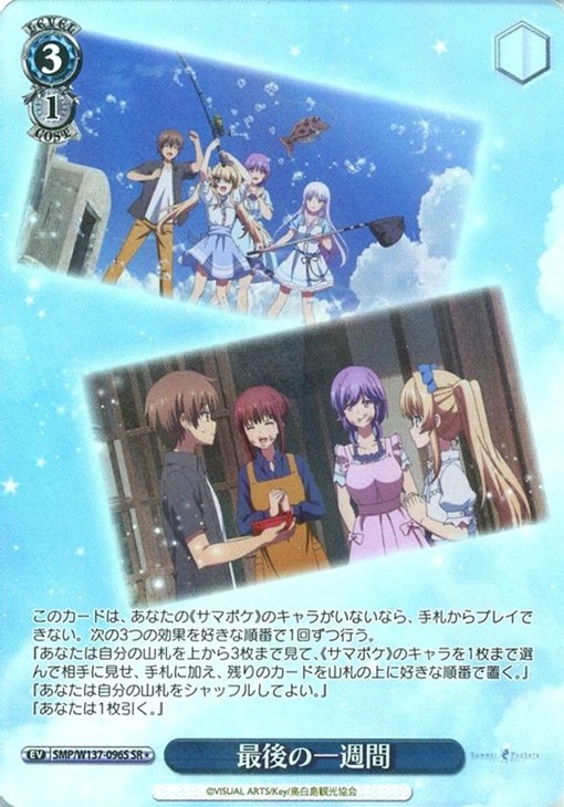 『あなたは自分の山札を上から3枚まで見て、《サマポケ》のキャラを1枚まで選んで相手に見せ、手札に加え、残りのカードを山札の上に好きな順番で置く。』