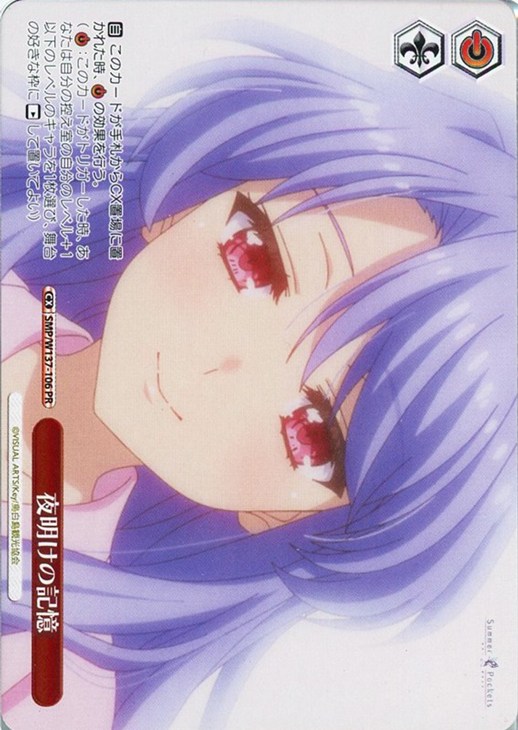 (スタンバイ:このカードがトリガーした時、あなたは自分の控え室の自分のレベル+1以下のレベルのキャラを1枚選び、舞台の好きな枠に【レスト】して置いてよい)