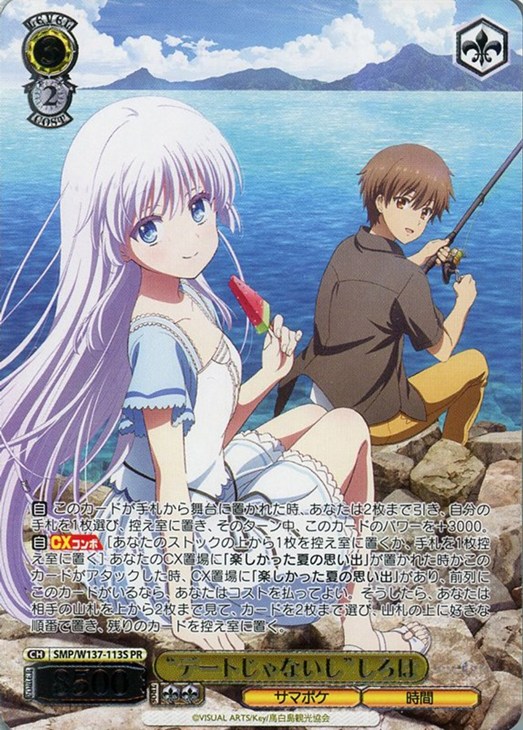 【自】【CXコンボ】[あなたのストックの上から1枚を控え室に置くか、手札を1枚控え室に置く] あなたのCX置場に「楽しかった夏の思い出」が置かれた時かこのカードがアタックした時、CX置場に「楽しかった夏の思い出」があり、前列にこのカードがいるなら、あなたはコストを払ってよい。そうしたら、あなたは相手の山札を上から2枚まで見て、カードを2枚まで選び、山札の上に好きな順番で置き、残りのカードを控え室に置く。