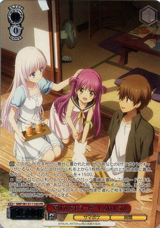 【自】 このカードが手札から舞台に置かれた時、他のあなたの《サマポケ》のキャラがいるなら、あなたは自分の山札を上から1枚見て、山札の上か控え室に置き、そのターン中、このカードのパワーを+1500。