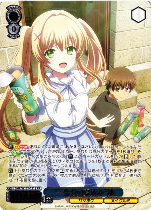 【自】【CXコンボ】 あなたのCX置場に「おかえりなさい」が置かれた時、他のあなたの《サマポケ》のキャラが2枚以上なら、あなたは自分のキャラを1枚選び、そのターン中、次の能力を与える。『【自】 このカードのバトル相手が【リバース】した時、あなたは自分の山札を見て《サマポケ》のキャラを1枚まで選んで相手に見せ、手札に加え、その山札をシャッフルする。』