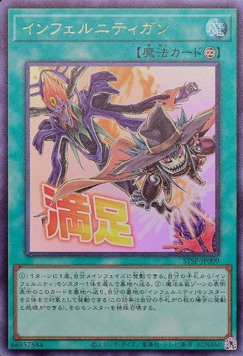 - ①:1ターンに1度、自分メインフェイズに発動できる。自分の手札から「インフェルニティ」モンスター1体を選んで墓地へ送る。②:魔法&罠ゾーンの表側表示のこのカードを墓地へ送り、自分の墓地の「インフェルニティ」モンスターを2体まで対象として発動できる(この効果は自分の手札が0枚の場合に発動と処理ができる)。そのモンスターを特殊召喚する。