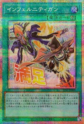 - ①:1ターンに1度、自分メインフェイズに発動できる。自分の手札から「インフェルニティ」モンスター1体を選んで墓地へ送る。②:魔法&罠ゾーンの表側表示のこのカードを墓地へ送り、自分の墓地の「インフェルニティ」モンスターを2体まで対象として発動できる(この効果は自分の手札が0枚の場合に発動と処理ができる)。そのモンスターを特殊召喚する。