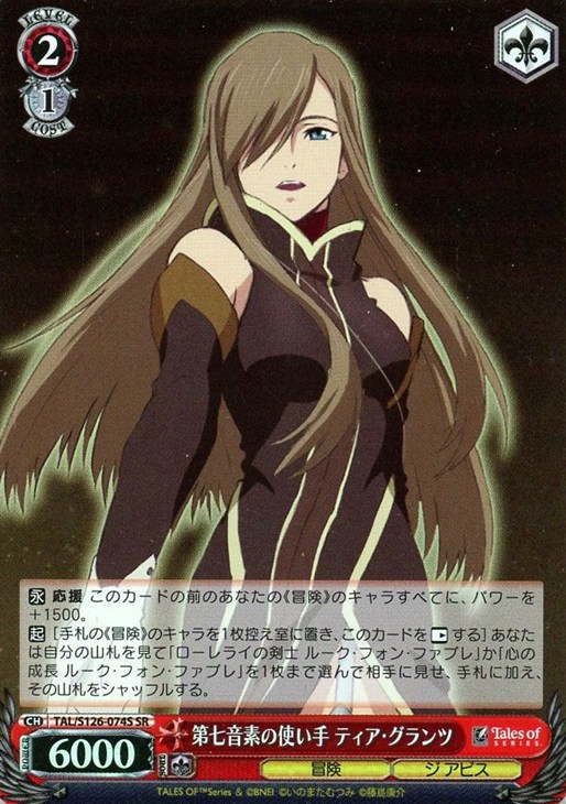 【起】[手札の《冒険》のキャラを1枚控え室に置き、このカードを【レスト】する] あなたは自分の山札を見て「ローレライの剣士 ルーク・フォン・ファブレ」か「心の成長 ルーク・フォン・ファブレ」を1枚まで選んで相手に見せ、手札に加え、その山札をシャッフルする。