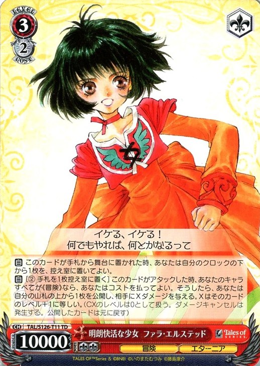 【自】[(2) 手札を1枚控え室に置く] このカードがアタックした時、あなたのキャラすべてが《冒険》なら、あなたはコストを払ってよい。そうしたら、あなたは自分の山札の上から1枚を公開し、相手にXダメージを与える。Xはそのカードのレベル+1に等しい。(CXのレベルは0として扱う。ダメージキャンセルは発生する。公開したカードは元に戻す)