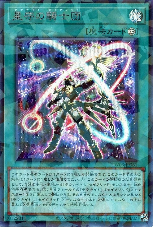 - このカード名のカードは1ターンに1枚しか発動できず、このカード名の②の効果は1ターンに1度しか使用できない。①:このカードの発動時の効果処理として、自分の手札・墓地から「テラナイト」、「セイクリッド」モンスター1体を特殊召喚できる。②:自分フィールドの「テラナイト」、「セイクリッド」Xモンスター1体を対象として発動できる。その自分のモンスターとはランクが異なる「テラナイト」、「セイクリッド」Xモンスター1体を、対象のモンスターの上に重ねてX召喚扱いでEXデッキから特殊召喚する。