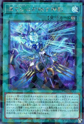 - このカード名の①②の効果はそれぞれ1ターンに1度しか使用できず、この効果を発動するターン、自分は「シャドール」モンスターしかEXデッキから特殊召喚できない。①:このカードの発動時の効果処理として、EXデッキから融合モンスター1体を墓地へ送る。②:自分フィールドの融合モンスター1体をリリースして発動できる。そのモンスターとは属性が異なる「シャドール」融合モンスター1体をEXデッキから融合召喚扱いで特殊召喚する。この効果で特殊召喚したモンスターの攻撃力は0になる。