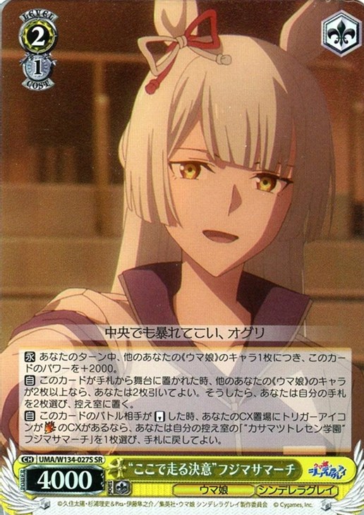 【自】 このカードのバトル相手が【リバース】した時、あなたのCX置場にトリガーアイコンがショットのCXがあるなら、あなたは自分の控え室の「“カサマツトレセン学園”フジマサマーチ」を1枚選び、手札に戻してよい。