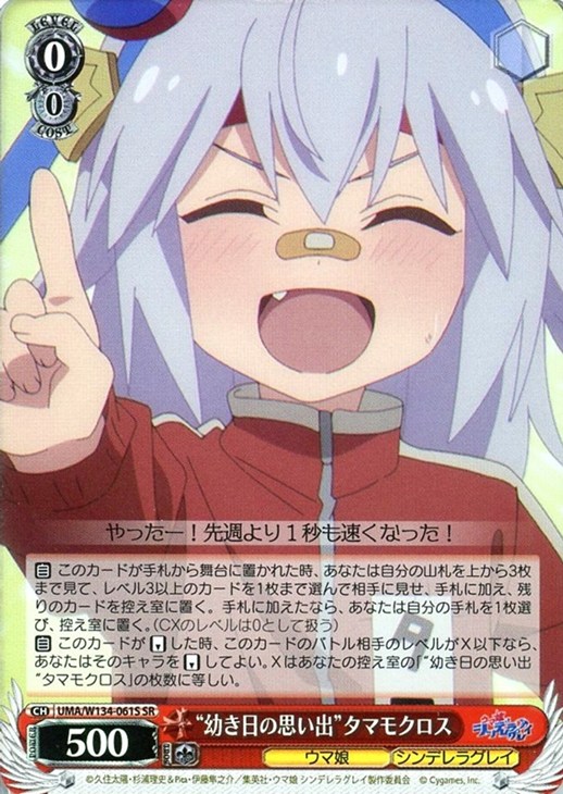 【自】 このカードが【リバース】した時、このカードのバトル相手のレベルがX以下なら、あなたはそのキャラを【リバース】してよい。Xはあなたの控え室の「“幼き日の思い出“タマモクロス」の枚数に等しい。