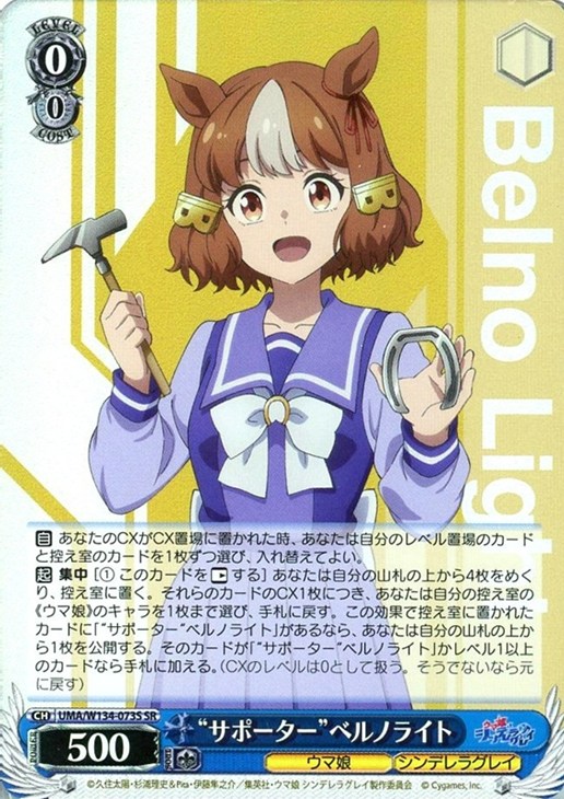 【起】 集中 [(1) このカードを【レスト】する] あなたは自分の山札の上から4枚をめくり、控え室に置く。それらのカードのCX1枚につき、あなたは自分の控え室の《ウマ娘》のキャラを1枚まで選び、手札に戻す。この効果で控え室に置かれたカードに「“サポーター”ベルノライト」があるなら、あなたは自分の山札の上から1枚を公開する。そのカードが「“サポーター“ベルノライト」かレベル1以上のカードなら手札に加える。(CXのレベルは0として扱う。そうでないなら元に戻す)