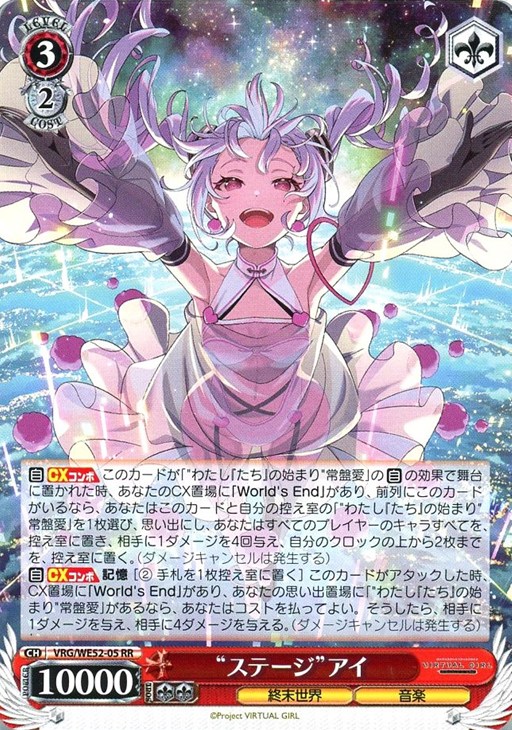 - 【自】【CXコンボ】 このカードが「”わたし『たち』の始まり”常盤愛」の【自】の効果で舞台に置かれた時、あなたのCX置場に「World’s End」があり、前列にこのカードがいるなら、あなたはこのカードと自分の控え室の「”わたし『たち』の始まり”常盤愛」を1枚選び、思い出にし、あなたはすべてのプレイヤーのキャラすべてを、控え室に置き、相手に1ダメージを4回与え、自分のクロックの上から2枚までを、控え室に置く。(ダメージキャンセルは発生する)