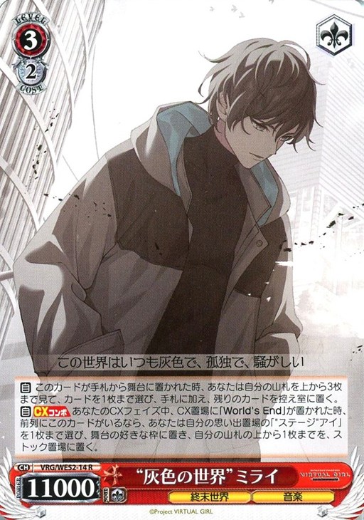 【自】【CXコンボ】 あなたのCXフェイズ中、CX置場に「World’s End」が置かれた時、前列にこのカードがいるなら、あなたは自分の思い出置場の「”ステージ”アイ」を1枚まで選び、舞台の好きな枠に置き、自分の山札の上から1枚までを、ストック置場に置く。
