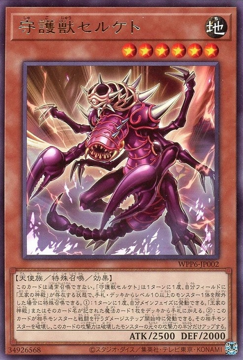- このカードは通常召喚できない。「守護獣セルケト」は1ターンに1度、自分フィールドに「王家の神殿」が存在する状態で、手札・デッキからレベル10以上のモンスター1体を除外した場合に特殊召喚できる。①:1ターンに1度、自分メインフェイズに発動できる。「王家の神殿」またはそのカード名が記された魔法カード1枚をデッキから手札に加える。②:このカードが相手モンスターと戦闘を行うダメージステップ開始時に発動できる。その相手モンスターを破壊し、このカードの攻撃力は破壊したモンスターの元々の攻撃力の半分だけアップする。