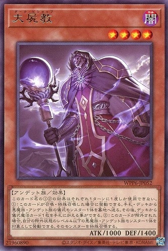 このカード名の①②の効果はそれぞれ1ターンに1度しか使用できない。①:このカードが召喚・特殊召喚した場合に発動できる。手札・デッキから悪魔族・アンデット族の儀式モンスター1体を墓地へ送る。その後、デッキから儀式魔法カード1枚を手札に加える事ができる。②:このカードが除外された場合、自分の除外状態のレベル4以下の悪魔族・アンデット族モンスター1体を対象として発動できる。そのモンスターを特殊召喚する。