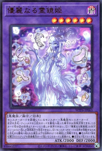 自分の手札・フィールドの上記のカードを墓地へ送った場合のみ特殊召喚できる。このカード名の②の効果は1ターンに1度しか使用できない。①:「優麗なる霊鏡姫」は自分フィールドに1枚しか表側表示で存在できない。②:モンスターがカードの効果を発動するために手札から墓地へ送られた場合、以下の効果から1つを選択して発動できる。●その内の1体を攻撃力500アップの装備魔法カード扱いでこのカードに装備する。●自分は1枚ドローする。