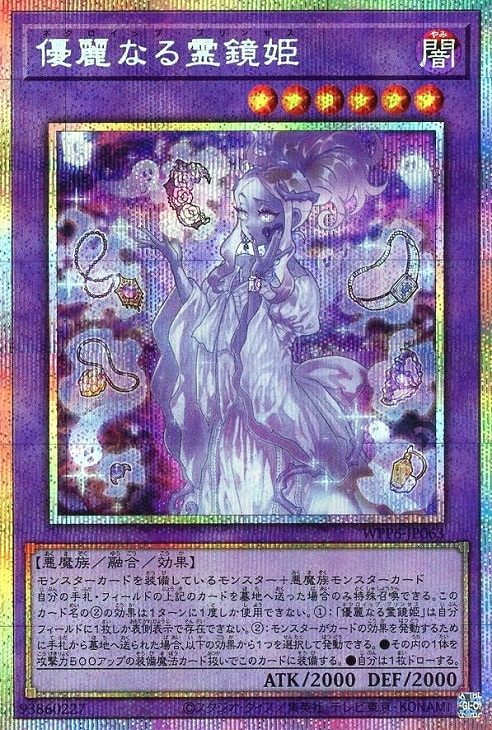 自分の手札・フィールドの上記のカードを墓地へ送った場合のみ特殊召喚できる。このカード名の②の効果は1ターンに1度しか使用できない。①:「優麗なる霊鏡姫」は自分フィールドに1枚しか表側表示で存在できない。②:モンスターがカードの効果を発動するために手札から墓地へ送られた場合、以下の効果から1つを選択して発動できる。●その内の1体を攻撃力500アップの装備魔法カード扱いでこのカードに装備する。●自分は1枚ドローする。