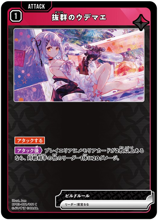 【アタック後】プレイエリアにメモリアカードが2枚以上あるなら、対戦相手の他のリーダー1体に20ダメージ。