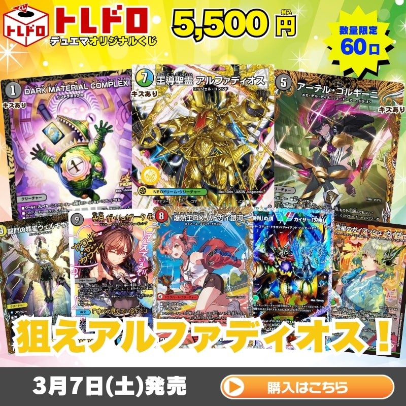 【デュエルマスターズ】3月7日発売!5500円トレドロ!! 大人気トレドロ販売!! 今回は 狙えアルファディオス! 1口5500円、60口限定で発売いたします!! 注目カードとして 「キズあり)シークレットドリームレア◇王導聖霊 アルファディオス」 をご用意しました! トレドロは中身を全て公開中! 早速封入カードをチェック!!! ※販売価格は全てクジ作成時(2026/3/4)の価格となります。 ★キズあり★ 王導聖霊 アルファディオス1枚 1口 58320円(税込) ★キズあり★ アーテル・ゴルギーニ1枚 1口 26820円(税込) ★キズあり★ DARK MATERIAL COMPLEX[WINNER]1枚 1口 17820円(税込) 爆銀王剣 バトガイ刃斗/爆熱王DX バトガイ銀河1枚 1口 17800円(税込) 卍月 ガ・リュザーク 卍/「すべて見えているぞ!」1枚 1口 15800円(税込) 「勝利」の頂 カイザー「刃鬼」1枚 1口 14800円(税込) 流星のガイアッシュ・カイザー1枚 1口 14800円(税込) 闘門の精霊ウェルキウス1枚 1口 12800円(税込) 天災 デドダム1枚 1口 10800円(税込) 邪帝斧 デッドアックス/真なる邪悪 ザ=デッドマン1枚 1口 9280円(税込) 大樹王 ギガンディダノス[箔押し]1枚 1口 7980円(税込) ★キズあり★ ドラゴンズ・サイン1枚 1口 7920円(税込) 葉鳴妖精ハキリ1枚 1口 7480円(税込) コッコ・武・ルピア1枚 1口 6980円(税込) 頂上接続 ムザルミ=ブーゴ1st1枚 1口 6980円(税込) 竜皇神 ボルシャック・バクテラス1枚 1口 6980円(税込) 百鬼の邪王門1枚 1口 6980円(税込) 真気楼と誠偽感の決断1枚 1口 6980円(税込) ★キズあり★ 飛翔龍 5000VT1枚 1口 6552円(税込) 蒼き夢双 ドギラゴン天1枚 1口 6480円(税込) 剣轟の団長 ドギラゴン王道1枚 4口 4280円(税込) 轟く邪道 レッドゾーン1枚 4口 3680円(税込) 鬼ヶ覇覇覇 ジャオウガ1枚 4口 3080円(税込) 月下卍壊 ガ・リュミーズ 卍1枚 4口 2980円(税込) ★キズあり★ アーテル・ゴルギーニ1枚 4口 2862円(税込) 流星のガイアッシュ・カイザー1枚 4口 2580円(税込) 魔誕の封殺ディアス Z1枚 4口 2580円(税込) PP-「P」1枚 4口 2380円(税込) ハンプティ・ルピア1枚 4口 2180円(税込) 飛翔龍 5000VT1枚 4口 1980円(税込) トレドロ5500円クジは 3月7日 18:00より発売開始!!! ご購入は↓の画像をクリック!!!