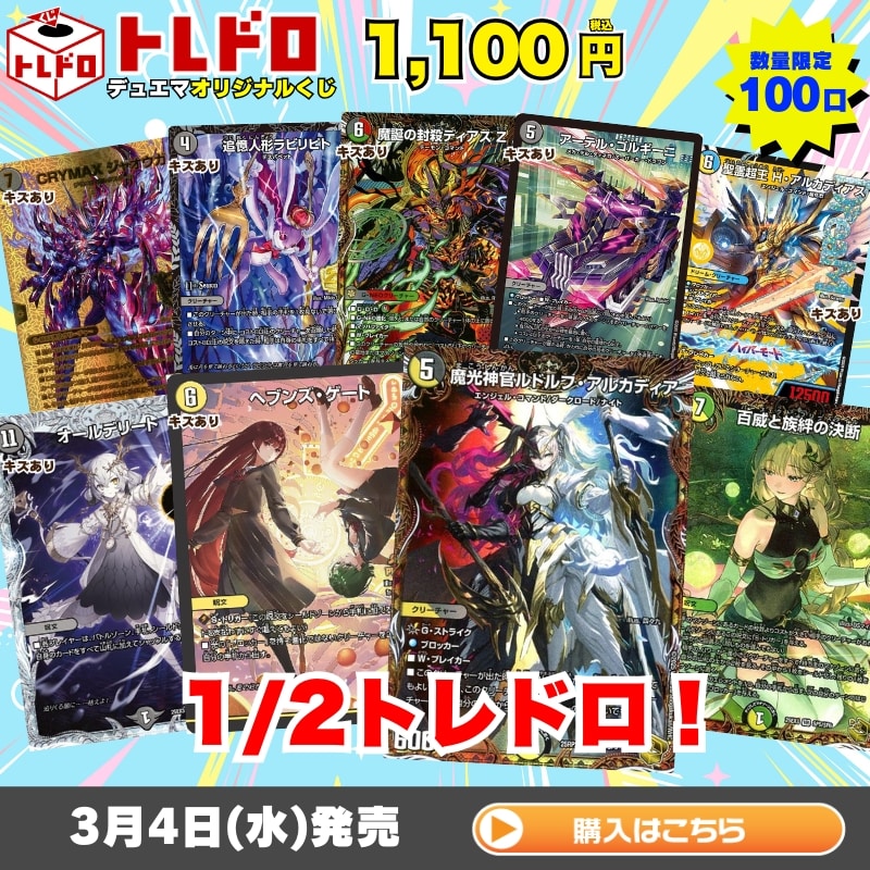 【デュエルマスターズ】3月4日発売!1100円トレドロ!! 大人気トレドロ販売!! 今回は、1/2トレドロ! 当たり確率1/2で作成しました! 1口1100円、100口で発売いたします!! 目玉カードとして、 「宝箱金◇魔光神官ルドルフ・アルカディア」 等々ご用意しました! もちろんトレドロは今回も中身を全て公開中! 早速封入カードをチェック!!! ※販売価格は全て2026/2/28の価格となります。 魔光神官ルドルフ・アルカディア1枚 1口 10800円(税込) ★キズあり★ ヘブンズ・ゲート[月詠み]1枚 1口 6282円(税込) 百威と族絆の決断1枚 1口 5980円(税込) ★キズあり★ オールデリート1枚 1口 3132円(税込) ★キズあり★ アーテル・ゴルギーニ1枚 1口 2862円(税込) ★キズあり★ 魔誕の封殺ディアス Z1枚 1口 2502円(税込) ★キズあり★ 追憶人形ラビリピト1枚 1口 2502円(税込) ★キズあり★ 聖霊超王 H・アルカディアス1枚 1口 2502円(税込) ★キズあり★ CRYMAX ジャオウガ1枚 1口 2412円(税込) ★キズあり★ 氷柱と炎弧の決断1枚 1口 2412円(税込) PP-「P」1枚 1口 2380円(税込) ★キズあり★ 流星のガイアッシュ・カイザー1枚 1口 2322円(税込) ★キズあり★ 水神 ミヅハノメノカミ1枚 1口 2232円(税込) ★キズあり★ 煌銀河最終形態 ギラングレイル1枚 1口 2232円(税込) ★キズあり★ エンドレス・フローズン・カーニバル1枚 1口 2232円(税込) ★キズあり★ アルカディアス・モモキング1枚 1口 2232円(税込) ★キズあり★ ルード・ザーナ1枚 1口 2232円(税込) ★キズあり★ 堕∞魔 ヴォゲンム1枚 1口 2232円(税込) 覇王の特権大使、キサラギ1枚 1口 2180円(税込) 時空の精圧ドラヴィタ/龍圧の覚醒者ヴァーミリオン・ドラヴィタ1枚 1口 2080円(税込) ★キズあり★ 勝熱英雄 モモキング1枚 1口 2052円(税込) ★キズあり★ 飛翔龍 5000VT1枚 1口 2052円(税込) ~世紀末の善悪~1枚 1口 1980円(税込) ★キズあり★ 魔光神官ルドルフ・アルカディア1枚 1口 1962円(税込) ★キズあり★ 光鎧龍ホーリーグレイス1枚 1口 1962円(税込) ★キズあり★ 洗打の妖精1枚 1口 1962円(税込) ネオ・ボルメテウス・ホワイト・ドラゴン1枚 1口 1880円(税込) ~西方より来る激流の竜騎公~1枚 1口 1880円(税込) 天災 デドダム1枚 1口 1880円(税込) ★キズあり★ ヨビニオン・マルル1枚 1口 1872円(税込) ★キズあり★ 邪爪の魔法陣1枚 1口 1872円(税込) ★キズあり★ 奇石 ミクセル/ジャミング・チャフ1枚 1口 1782円(税込) ★キズあり★ 魔誕の斬将オルゲイト1枚 1口 1782円(税込) ★キズあり★ 音卿の精霊龍 ラフルル・ラブ/「未来から来る、だからミラクル」1枚 1口 1782円(税込) ★キズあり★ フェアリー・Re:ライフ[箔押し]1枚 1口 1782円(税込) ★キズあり★ ~世紀末の善悪~1枚 1口 1782円(税込) ★キズあり★ ボルシャック・ドリーム・ドラゴン1枚 1口 1782円(税込) ★キズあり★ 飛翔龍 5000VT1枚 1口 1782円(税込) 終止の時計 ザ・ミュート1枚 1口 1780円(税込) 爆銀王剣 バトガイ刃斗/爆熱王DX バトガイ銀河1枚 1口 1780円(税込) 邪龍 ジャジーブラッド1枚 1口 1780円(税込) 龍仙ロマネスク1枚 1口 1680円(税込) 一音の妖精1枚 1口 1680円(税込) ★キズあり★ 王導聖霊 アルファディオス1枚 1口 1602円(税込) 聖魔連結王 ドルファディロム1枚 1口 1580円(税込) 光夢龍フィオナ・フォレスト1枚 1口 1580円(税込) ★キズあり★ 修羅の死神フミシュナ/「この先は修羅の道ぞ」1枚 1口 1512円(税込) ★キズあり★ 流星のガイアッシュ・カイザー1枚 1口 1512円(税込) ★キズあり★ 一王二命三眼槍1枚 1口 1512円(税込) ★キズあり★ 時の法皇 ミラダンテXII1枚 1口 1512円(税込) 王闘竜皇 ボルシャック・ドラゴン1枚 4口 680円(税込) 轟シャ合体 ゴルギーオージャー1枚 4口 680円(税込) 料理長のラビシェフ1枚 4口 680円(税込) 切札勝太&カツキング -熱血の物語-1枚 4口 680円(税込) 王道の革命 ドギラゴン1枚 2口 680円(税込) 試算の妖精1枚 4口 630円(税込) 魔誕の悪魔デスモナーク1枚 4口 580円(税込) 地封龍 ギャイア1枚 4口 580円(税込) 創世竜 Drache der’Zen1枚 4口 580円(税込) ★キズあり★ 雷撃の冥将クーゼン/ダーク・ライフ1枚 4口 578円(税込) 危険深淵 デンジャラス=ジャック1枚 4口 530円(税込) BARUGA-雷座871枚 4口 500円(税込) 俳句爵 Drache der’Bande1枚 4口 480円(税込) トレドロ1100円クジは 3/4 18:00より発売開始!!! ご購入は↓の画像をクリック!!! 買い物カゴページにて個数を増やすことができます。