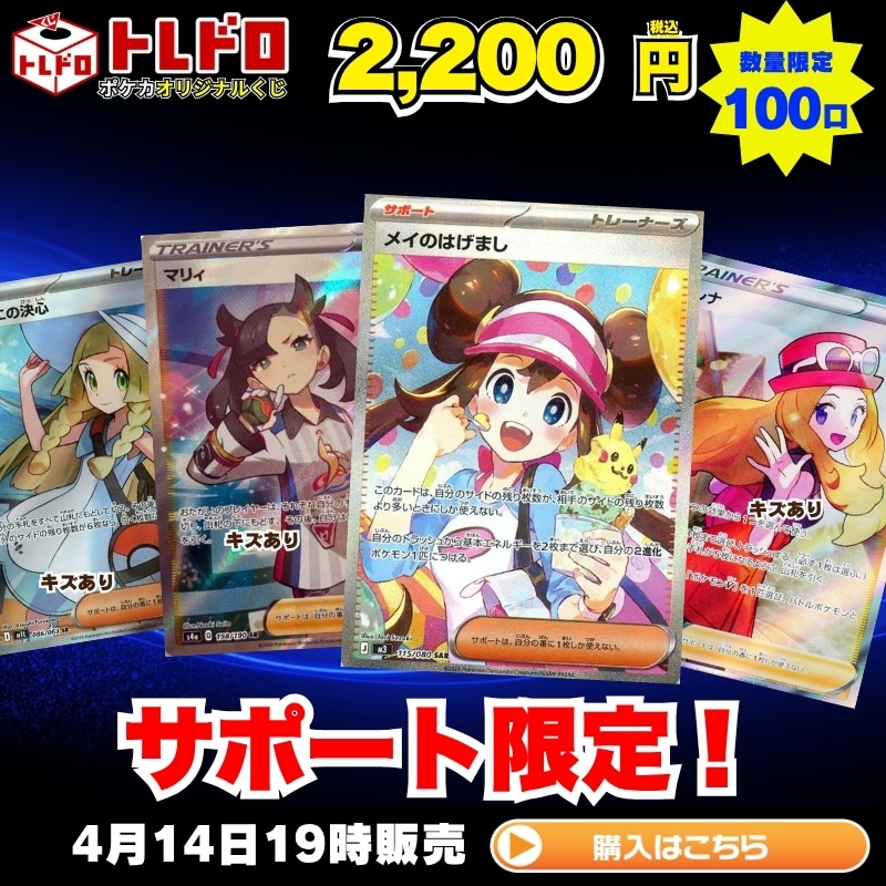 【ポケカ】4月14日発売!トレドロ2200円クジ!! トレドロ販売!! 本日発売のポケカのトレドロは 1口2200円 のトレドロを100口ご用意致しました!! 気になる大当たりは! 【メイのはげまし】 【★キズあり★マリィ】 【★キズあり★セレナ】 等々豪華な仕上がりとなっております!! 発売は 4/14(火)19時より販売開始!! それでは早速封入カードをチェック!! ※販売価格は全てくじ作成日(4/11)の価格となります。 当たり! メイのはげまし1枚 1口 27800円(税込) 当たり! ★キズあり★マリィ1枚 1口 21080円(税込) 当たり! ★キズあり★セレナ1枚 1口 12580円(税込) 当たり! ★キズあり★リーリエの決心1枚 1口 10880円(税込) 当たり! タロ1枚 1口 8380円(税込) 当たり! ★キズあり★ユウリ1枚 1口 7633円(税込) 当たり! ★キズあり★ベルのまごころ1枚 1口 7633円(税込) 当たり! ★キズあり★ヒビキの冒険1枚 1口 6783円(税込) 当たり! ★キズあり★マツバの確信1枚 1口 6358円(税込) 当たり! カナリィ1枚 1口 5580円(税込) 当たり! ★キズあり★かんこうきゃく1枚 1口 5083円(税込) 当たり! ★キズあり★ヨシダ警部補1枚 1口 4658円(税込) 当たり! ★キズあり★ヒカリ1枚 1口 4233円(税込) 当たり! ★キズあり★グリーンの戦略1枚 1口 4233円(税込) 当たり! ★キズあり★カミツレのきらめき1枚 1口 3468円(税込) 当たり! ★キズあり★スグリ1枚 1口 3383円(税込) 当たり! カシオペア1枚 1口 2980円(税込) 当たり! メイのはげまし1枚 1口 2780円(税込) 当たり! ★キズあり★エーテル財団職員1枚 1口 2703円(税込) 当たり! スイレンのお世話1枚 1口 2580円(税込) 当たり! ★キズあり★ミモザ1枚 1口 2533円(税込) 当たり! ★キズあり★アイリスの闘志1枚 1口 2448円(税込) 当たり! ★キズあり★メイのはげまし1枚 1口 2363円(税込) 当たり! ホミカの演奏1枚 1口 2280円(税込) ハズレ… ロケット団のサカキ1枚 3口 1880円(税込) ハズレ… ★キズあり★カナリィ1枚 4口 1768円(税込) ハズレ… ★キズあり★ボタン1枚 2口 1768円(税込) ハズレ… ベルのまごころ1枚 3口 1680円(税込) ハズレ… ★キズあり★ロケット団のサカキ1枚 1口 1598円(税込) ハズレ… ★キズあり★ユカリ1枚 3口 1513円(税込) ハズレ… ★キズあり★ミツルの思いやり1枚 2口 1513円(税込) ハズレ… AZの安らぎ1枚 4口 1480円(税込) ハズレ… セイジ1枚 3口 1280円(税込) ハズレ… ★キズあり★シンオウの仲間たち1枚 3口 1258円(税込) ハズレ… ロケット団のアポロ1枚 5口 1180円(税込) ハズレ… ★キズあり★ロケット団のアテナ1枚 5口 1173円(税込) ハズレ… ★キズあり★セイジ1枚 1口 1088円(税込) ハズレ… ★キズあり★ヒナツ1枚 5口 1088円(税込) ハズレ… ★キズあり★ペパー1枚 6口 1088円(税込) ハズレ… ★キズあり★キバナ1枚 5口 1088円(税込) ハズレ… ★キズあり★セキ1枚 5口 1088円(税込) ハズレ… ★キズあり★ロケット団のランス1枚 3口 1088円(税込) ハズレ… ★キズあり★ネモ1枚 2口 1088円(税込) ハズレ… ★キズあり★サワロ1枚 5口 1003円(税込) ハズレ… ★キズあり★ツツジ1枚 2口 1003円(税込) ハズレ… ★キズあり★ジニア1枚 2口 1003円(税込) ハズレ… ★キズあり★ペパー1枚 2口 1003円(税込) ポケカトレドロ2200円クジは 4/14(火) 19時より発売開始!!! ご購入は下の画像をクリック!!