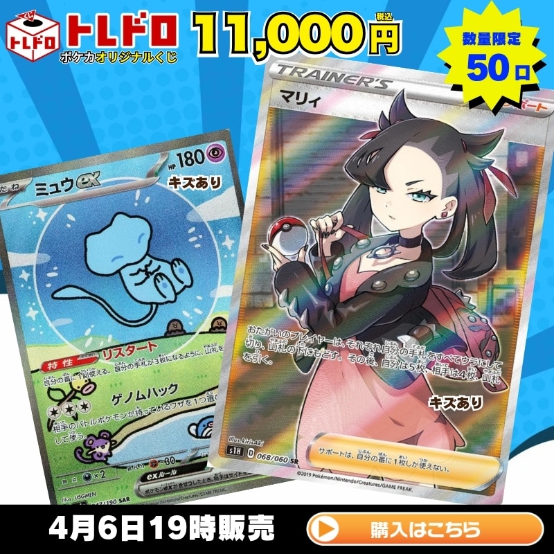 【ポケカ】4月6日発売!11000円トレドロ! トレドロ販売!! 本日発売のポケカのトレドロは 1口11000円 のトレドロを50口ご用意致しました!! 気になる大当たりは! 【★キズあり★マリィ】 【★キズあり★ミュウex】 【★キズあり★_のピカチュウ】 等々豪華な仕上がりとなっております!! 発売は 4/6(月)19時より販売開始!! それでは早速封入カードをチェック!! ※販売価格は全てくじ作成日(4/4)の価格となります。 当たり! ★キズあり★マリィ1枚 1口 70380円(税込) 当たり! ★キズあり★ミュウex1枚 1口 62730円(税込) 当たり! ★キズあり★_のピカチュウ1枚 1口 55930円(税込) 当たり! ★キズあり★ブラッキー☆1枚 1口 32980円(税込) 当たり! ヒロシマのピカチュウ1枚 1口 27800円(税込) 当たり! ★キズあり★メイのはげまし1枚 1口 23630円(税込) 当たり! ★キズあり★コイキング1枚 1口 20230円(税込) 当たり! ★キズあり★ボスの指令1枚 1口 16830円(税込) 当たり! ★キズあり★ピカチュウV1枚 1口 15130円(税込) 当たり! ★キズあり★スターミーV1枚 1口 14280円(税込) 当たり! ★キズあり★リザードンVSTAR1枚 1口 13430円(税込) 当たり! ★キズあり★ナンジャモ1枚 1口 12580円(税込) 当たり! ★キズあり★エンペルトV1枚 1口 12580円(税込) 当たり! ★キズあり★リーリエの決心1枚 1口 11730円(税込) 当たり! ★キズあり★アルセウス1枚 1口 11730円(税込) ハズレ… ★キズあり★イーブイ1枚 1口 10880円(税込) ハズレ… ユウリ1枚 2口 8980円(税込) ハズレ… ★キズあり★ゼニガメ1枚 2口 8313円(税込) ハズレ… ナンジャモ1枚 1口 7980円(税込) ハズレ… ★キズあり★Nのゾロアークex1枚 2口 7633円(税込) ハズレ… ★キズあり★ナンジャモ1枚 2口 6783円(税込) ハズレ… メガラティアスex1枚 1口 6480円(税込) ハズレ… ★キズあり★メガリザードンXex1枚 4口 6443円(税込) ハズレ… イーブイex1枚 3口 6280円(税込) ハズレ… ★キズあり★ピカチュウ1枚 4口 5933円(税込) ハズレ… ★キズあり★メガラティアスex1枚 1口 5508円(税込) ハズレ… ★キズあり★カビゴンVMAX1枚 2口 5083円(税込) ハズレ… メガガルーラex1枚 1口 4580円(税込) ハズレ… ★キズあり★フウロ1枚 2口 4488円(税込) ハズレ… ★キズあり★メガガルーラex1枚 1口 3893円(税込) ハズレ… ★キズあり★エンテイV1枚 3口 3893円(税込) ハズレ… メガゲッコウガex1枚 3口 3580円(税込) ポケカトレドロ11000円クジは 4/6(月) 19時より発売開始!!! ご購入は下の画像をクリック!!