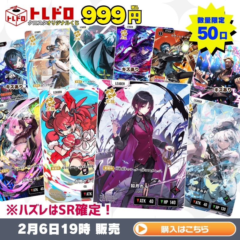 【クロスタ】2月6日19時発売!!トレドロ999円 トレドロ販売!! 本日発売のクロスタのトレドロは 1口999円 のトレドロを50口ご用意致しました!! 気になる大当たりは! 【如月れん】 【花芽すみれ】 【赤見かるび】 等々豪華な仕上がりとなっております!! 発売は 2/6(金)19時より販売開始!! それでは早速封入カードをチェック!! ※販売価格は全てくじ作成日(2/5)の価格となります。 当たり! 如月れん1枚 1口 13800円(税込) 当たり! 花芽すみれ1枚 1口 7980円(税込) 当たり! 赤見かるび1枚 1口 7480円(税込) 当たり! 天鬼ぷるる1枚 1口 6180円(税込) 当たり! VanilLa1枚 1口 2980円(税込) 当たり! Kamito1枚 1口 2980円(税込) 当たり! ★キズあり★どぐら1枚 1口 2788円(税込) 当たり! ロケットランチャー1枚 1口 2780円(税込) 当たり! ★キズあり★一騎当千1枚 1口 2363円(税込) 当たり! ★キズあり★勝利の雄たけび1枚 1口 2108円(税込) ハズレ… 三銃士1枚 8口 230円(税込) ハズレ… 恐怖の迷宮1枚 8口 230円(税込) ハズレ… 流行語大賞1枚 8口 230円(税込) ハズレ… 勝利の雄たけび1枚 8口 230円(税込) ハズレ… オールスターコンボ1枚 8口 230円(税込) クロスタトレドロ999円クジは 2/6(金) 19時より発売開始!!! ご購入は下の画像をクリック!!
