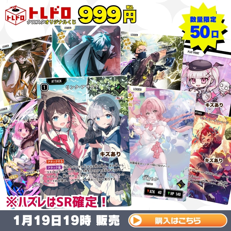 【クロスタ】1月19日19時発売!!トレドロ999円 トレドロ販売!! 本日発売のクロスタのトレドロは 1口999円 のトレドロを50口ご用意致しました!! 気になる大当たりは! 【★キズあり★リンク・アサルト】 【甘結もか】 【天鬼ぷるる】 等々豪華な仕上がりとなっております!! 発売は 1/19(月)19時より販売開始!! それでは早速封入カードをチェック!! ※販売価格は全てくじ作成日(1/19)の価格となります。 当たり! ★キズあり★リンク・アサルト1枚 1口 14280円(税込) 当たり! 甘結もか1枚 1口 8280円(税込) 当たり! 天鬼ぷるる1枚 1口 6380円(税込) 当たり! ★キズあり★ビクトリーランページ1枚 1口 6358円(税込) 当たり! VanilLa1枚 1口 3280円(税込) 当たり! かずのこ1枚 1口 2480円(税込) 当たり! わいわい1枚 1口 2080円(税込) 当たり! ★キズあり★PLAY POINT[空澄セナ]1枚 1口 1003円(税込) ハズレ… クロスファイア1枚 6口 280円(税込) ハズレ… 恐怖の迷宮1枚 6口 230円(税込) ハズレ… オールスターコンボ1枚 6口 230円(税込) ハズレ… 三銃士1枚 6口 230円(税込) ハズレ… 流行語大賞1枚 6口 230円(税込) ハズレ… 勝利の雄たけび1枚 6口 230円(税込) ハズレ… 変わらない関係1枚 6口 230円(税込) クロスタトレドロ999円クジは 1/19(月) 19時より発売開始!!! ご購入は下の画像をクリック!!