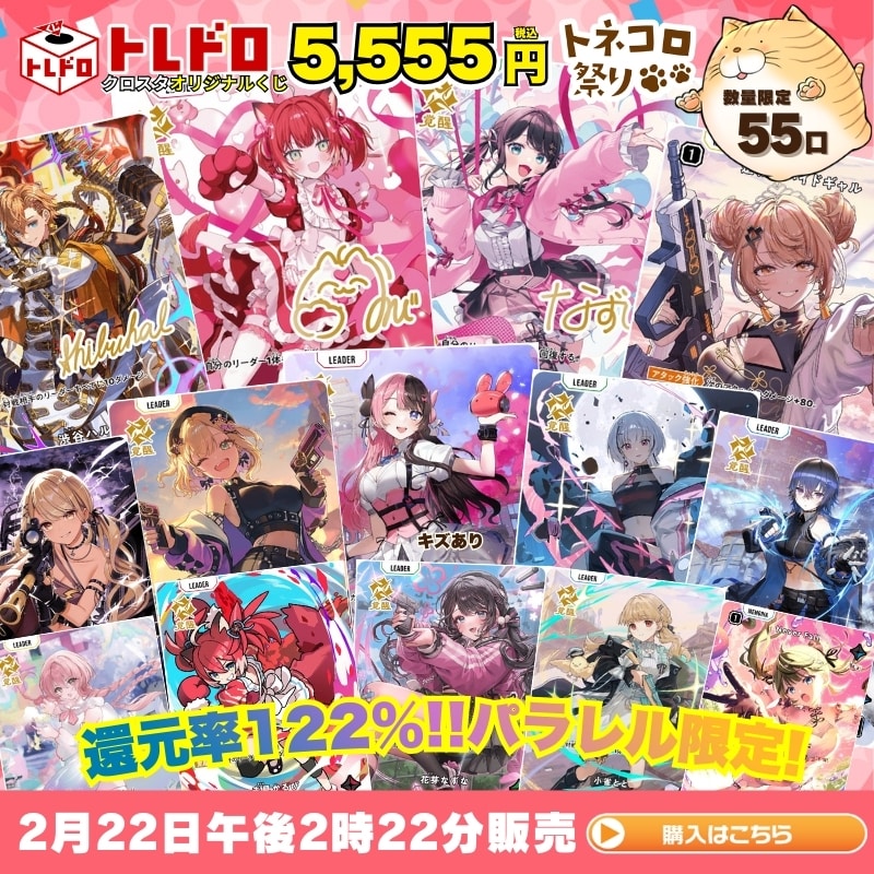 【トレドロバックナンバー】2/22(5555円) トレドロ販売!! 本日発売のクロスタのトレドロは 1口5555円 のトレドロを55口ご用意致しました!! 気になる大当たりは! 【花芽なずな】 【赤見かるび】 【逆転のハイドギャル】 等々豪華な仕上がりとなっております!! 発売は 2/22(日)午後2時22分より販売開始!! それでは早速封入カードをチェック!! ※販売価格は全てくじ作成日(2/16)の価格となります。 当たり! 花芽なずな1枚 1口 65800円(税込) 当たり! 赤見かるび1枚 1口 64800円(税込) 当たり! 逆転のハイドギャル1枚 1口 25800円(税込) 当たり! 渋谷ハル1枚 1口 20800円(税込) 当たり! ★キズあり★橘ひなの1枚 1口 19380円(税込) 当たり! 空澄セナ1枚 1口 18800円(税込) 当たり! 胡桃のあ1枚 1口 12800円(税込) 当たり! 一ノ瀬うるは1枚 1口 11800円(税込) 当たり! 神成きゅぴ1枚 1口 10800円(税込) 当たり! 花芽なずな1枚 1口 7480円(税込) 当たり! 赤見かるび1枚 1口 6980円(税込) 当たり! 甘結もか1枚 1口 6980円(税込) 当たり! 小雀とと1枚 1口 6580円(税込) 当たり! Never Fall1枚 1口 6380円(税込) ハズレ… 白雪レイド1枚 1口 4380円(税込) ハズレ… 渋谷ハル1枚 1口 3280円(税込) ハズレ… どぐら1枚 1口 3180円(税込) ハズレ… Kamito1枚 1口 2980円(税込) ハズレ… Ras1枚 1口 2780円(税込) ハズレ… VanilLa1枚 2口 2680円(税込) ハズレ… Selly1枚 1口 2680円(税込) ハズレ… ふらんしすこ1枚 2口 2280円(税込) ハズレ… Shuto1枚 3口 2080円(税込) ハズレ… かずのこ1枚 2口 2080円(税込) ハズレ… Cpt1枚 3口 2080円(税込) ハズレ… ボンちゃん1枚 6口 1980円(税込) ハズレ… 立川1枚 4口 1980円(税込) ハズレ… あれる1枚 4口 1980円(税込) ハズレ… トナカイト1枚 6口 1880円(税込) ハズレ… ごっちゃん@マイキー1枚 3口 1880円(税込) クロスタトレドロ5555円クジは 2/22(日) 午後2時22分より発売開始!!! ご購入は下の画像をクリック!!