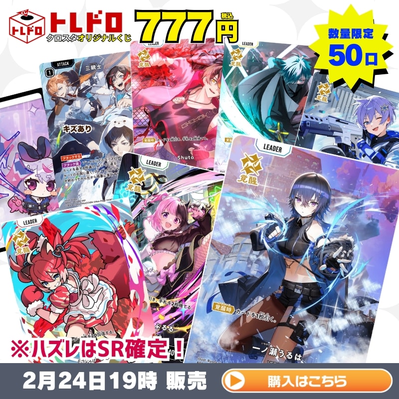 【トレドロバックナンバー】2/24 トレドロ販売!! 本日発売のクロスタのトレドロは 1口777円 のトレドロを50口ご用意致しました!! 気になる大当たりは! 【一ノ瀬うるは】 【赤見かるび】 【天鬼ぷるる】 等々豪華な仕上がりとなっております!! 発売は 2/24(火)19時より販売開始!! それでは早速封入カードをチェック!! ※販売価格は全てくじ作成日(2/24)の価格となります。 当たり! 一ノ瀬うるは1枚 1口 11800円(税込) 当たり! 赤見かるび1枚 1口 6480円(税込) 当たり! 天鬼ぷるる1枚 1口 5180円(税込) 当たり! 白雪レイド1枚 1口 3980円(税込) 当たり! VanilLa1枚 1口 2580円(税込) 当たり! Shuto1枚 1口 1980円(税込) 当たり! ★キズあり★三銃士1枚 1口 1938円(税込) 当たり! PLAY POINT[兎咲ミミ]1枚 1口 1180円(税込) ハズレ… 三銃士1枚 6口 200円(税込) ハズレ… 流行語大賞1枚 6口 200円(税込) ハズレ… 恐怖の迷宮1枚 6口 200円(税込) ハズレ… オールスターコンボ1枚 6口 200円(税込) ハズレ… 勝利の雄たけび1枚 6口 200円(税込) ハズレ… 勝利へのジャンプ1枚 6口 200円(税込) ハズレ… 変わらない関係1枚 6口 200円(税込) クロスタトレドロ777円クジは 2/24(火) 19時より発売開始!!! ご購入は下の画像をクリック!!