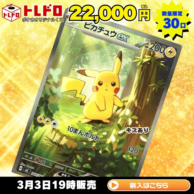 【トレドロバックナンバー】3/3 トレドロ販売!! 本日発売のポケカのトレドロは 1口22000円 のトレドロを30口ご用意致しました!! 気になる大当たりは! 【★キズあり★ピカチュウex】 【★キズあり★ゼクロムex】 【リザードンex】 等々豪華な仕上がりとなっております!! 発売は 3/3(火)19時より販売開始!! それでは早速封入カードをチェック!! ※販売価格は全てくじ作成日(3/2)の価格となります。 当たり! ★キズあり★ピカチュウex1枚 1口 151300円(税込) 当たり! ★キズあり★ゼクロムex1枚 1口 61880円(税込) 当たり! リザードンex1枚 1口 49800円(税込) 当たり! ★キズあり★メガジガルデex1枚 1口 38930円(税込) 当たり! ★キズあり★メガカイリューex1枚 1口 36380円(税込) 当たり! ★キズあり★リザードンVMAX1枚 1口 33830円(税込) 当たり! メイのはげまし1枚 1口 32800円(税込) 当たり! ★キズあり★ブラッキー☆1枚 1口 32130円(税込) 当たり! ★キズあり★ニンフィアV1枚 1口 25330円(税込) 当たり! マリィ1枚 1口 23800円(税込) ハズレ… ★キズあり★コイキング1枚 2口 20230円(税込) ハズレ… ゲンガー&ミミッキュGX1枚 1口 19800円(税込) ハズレ… ★キズあり★メガサーナイトex1枚 1口 18530円(税込) ハズレ… ★キズあり★ロケット団のファイヤーex1枚 1口 18530円(税込) ハズレ… ミュウツーVSTAR1枚 1口 15800円(税込) ハズレ… ニンフィア1枚 1口 14800円(税込) ハズレ… カメックス1枚 1口 14800円(税込) ハズレ… ★キズあり★スターミーV1枚 1口 14280円(税込) ハズレ… サザレ1枚 2口 12800円(税込) ハズレ… ★キズあり★レシラム1枚 1口 12580円(税込) ハズレ… ★キズあり★ニャースex1枚 2口 12580円(税込) ハズレ… ★キズあり★セレナ1枚 2口 12580円(税込) ハズレ… ★キズあり★ゼラオラV1枚 1口 12580円(税込) ハズレ… メガルカリオex1枚 1口 11800円(税込) ハズレ… ★キズあり★リーリエの決心1枚 2口 11730円(税込) ポケカトレドロ22000円クジは 3/3(火) 19時より発売開始!!! ご購入は下の画像をクリック!!