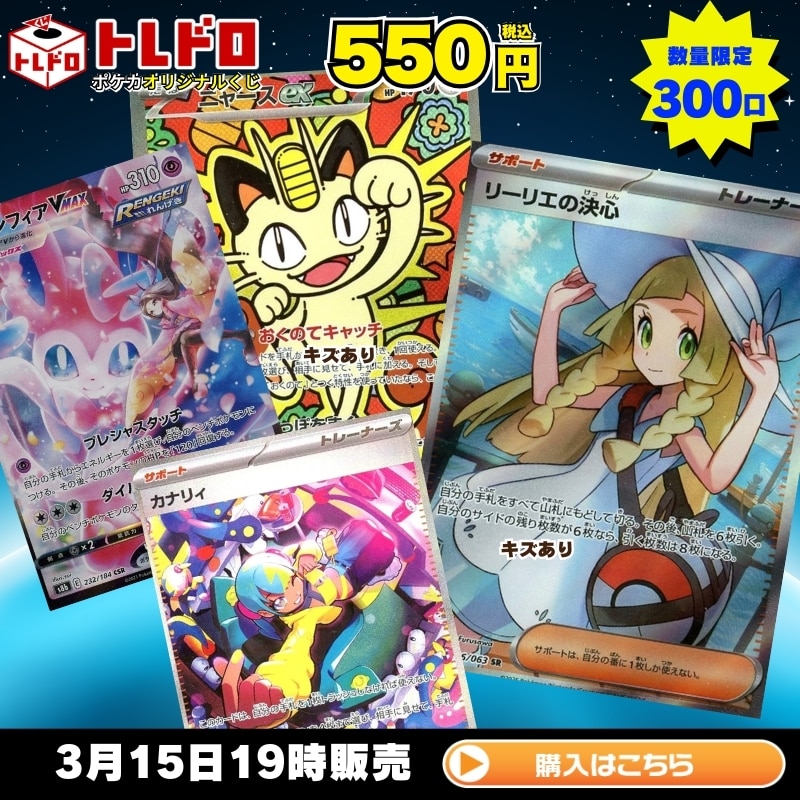 【トレドロバックナンバー】3/15 トレドロ販売!! 本日発売のポケカのトレドロは 1口550円 のトレドロを300口ご用意致しました!! 気になる大当たりは! 【★キズあり★リーリエの決心】 【★キズあり★ニャースex】 【ニンフィアVMAX】 等々豪華な仕上がりとなっております!! 発売は 3/15(日)19時より販売開始!! それでは早速封入カードをチェック!! ※販売価格は全てくじ作成日(3/10)の価格となります。 当たり! ★キズあり★リーリエの決心1枚 1口 11730円(税込) 当たり! ★キズあり★ニャースex1枚 1口 10030円(税込) 当たり! ニンフィアVMAX1枚 1口 8180円(税込) 当たり! カナリィ1枚 1口 7080円(税込) 当たり! ★キズあり★リザードンV1枚 1口 5933円(税込) 当たり! ★キズあり★ミライドンex1枚 1口 5933円(税込) 当たり! ★キズあり★メガリザードンXex1枚 1口 5848円(税込) 当たり! ★キズあり★オドリドリex1枚 1口 5423円(税込) 当たり! ★キズあり★ガラルギャロップV1枚 1口 4488円(税込) 当たり! ロケット団のラムダ1枚 1口 4180円(税込) 当たり! ジャローダex1枚 1口 3580円(税込) 当たり! ジャッジマン1枚 1口 3480円(税込) 当たり! ★キズあり★ヒスイゾロアークVSTAR1枚 1口 3383円(税込) 当たり! ★キズあり★メガスターミーex1枚 1口 3298円(税込) 当たり! ★キズあり★ジラーチ1枚 1口 3043円(税込) 当たり! ★キズあり★ミュウex1枚 1口 2958円(税込) 当たり! ★キズあり★バシャーモV1枚 1口 2958円(税込) 当たり! ヒビキのバクフーン1枚 1口 2580円(税込) 当たり! Nのレシラム1枚 1口 2480円(税込) 当たり! ★キズあり★カミツオロチex1枚 1口 2363円(税込) 当たり! ★キズあり★リザード1枚 1口 2363円(税込) 当たり! ★キズあり★ラッキー1枚 1口 2023円(税込) 当たり! ロケット団のニャース1枚 1口 1980円(税込) 当たり! ★キズあり★おじょうさま1枚 1口 1853円(税込) 当たり! ★キズあり★コーチトレーナー1枚 1口 1683円(税込) 当たり! ★キズあり★ビクティニVMAX1枚 1口 1683円(税込) 当たり! ★キズあり★コダック1枚 1口 1513円(税込) 当たり! フリーザー1枚 1口 1380円(税込) 当たり! ★キズあり★ピィ1枚 1口 1343円(税込) 当たり! ★キズあり★チルタリス1枚 1口 1343円(税込) 当たり! ★キズあり★ガラルファイヤーV1枚 1口 1258円(税込) 当たり! ★キズあり★モノマネむすめ1枚 1口 1258円(税込) 当たり! メガサーナイトex1枚 1口 1180円(税込) 当たり! メガルカリオex1枚 1口 1180円(税込) 当たり! ★キズあり★デデンネ1枚 1口 1173円(税込) 当たり! ★キズあり★ロケット団のファイヤーex1枚 1口 1173円(税込) 当たり! ★キズあり★ウルガモス1枚 1口 1173円(税込) 当たり! ★キズあり★リオル1枚 1口 1088円(税込) 当たり! ★キズあり★ガラルサンダーV1枚 1口 1088円(税込) 当たり! ★キズあり★メタモンV1枚 1口 1088円(税込) 当たり! ★キズあり★ロトムex1枚 1口 1088円(税込) 当たり! ★キズあり★キバナ1枚 1口 1088円(税込) 当たり! Nのゾロア1枚 1口 1080円(税込) 当たり! 博士の研究1枚 1口 1080円(税込) 当たり! マナフィ1枚 1口 980円(税込) 当たり! ★キズあり★ともだちてちょう1枚 1口 918円(税込) 当たり! ★キズあり★ピッピ1枚 1口 833円(税込) 当たり! ★キズあり★ヘルガー1枚 1口 833円(税込) 当たり! ★キズあり★メガスターミーex1枚 1口 833円(税込) 当たり! ★キズあり★マリィ1枚 1口 833円(税込) 当たり! リバーサルエネルギー1枚 1口 780円(税込) 当たり! ★キズあり★メガズルズキンex1枚 1口 620円(税込) ハズレ… モクロー1枚 22口 480円(税込) ハズレ… アマルルガ1枚 18口 350円(税込) ハズレ… エレザード1枚 18口 350円(税込) ハズレ… アゲハント1枚 15口 350円(税込) ハズレ… ミアレシティ1枚 20口 330円(税込) ハズレ… ラッタ1枚 20口 330円(税込) ハズレ… スピンロトム1枚 20口 300円(税込) ハズレ… ドロンチ1枚 15口 300円(税込) ポケカトレドロ550円クジは 3/15(日) 19時より発売開始!!! ご購入は下の画像をクリック!!