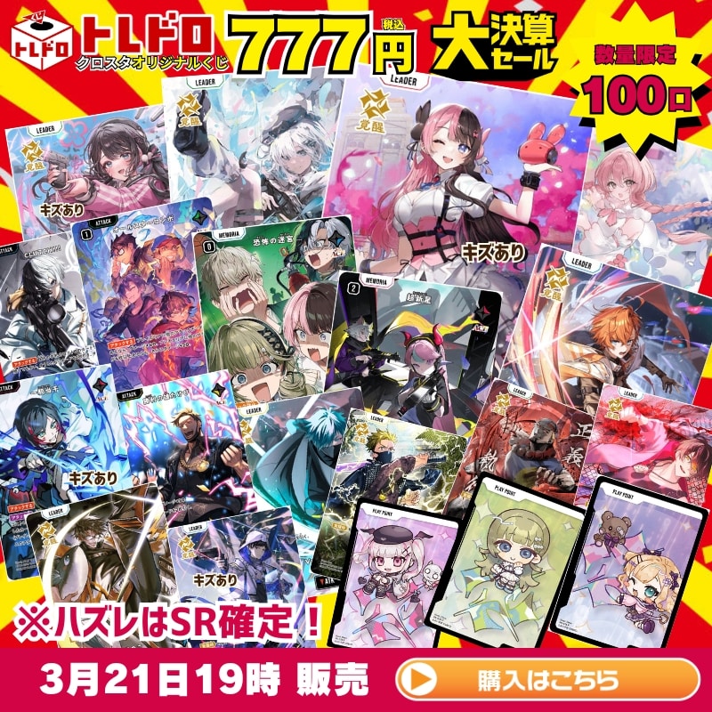 【トレドロバックナンバー】3/21 トレドロ販売!! 本日発売のクロスタのトレドロは 1口777円 のトレドロを100口ご用意致しました!! 気になる大当たりは! 【★キズあり★橘ひなの】 【花芽すみれ】 【甘結もか】 等々豪華な仕上がりとなっております!! 発売は 3/21(土)19時より販売開始!! それでは早速封入カードをチェック!! ※販売価格は全てくじ作成日(3/14)の価格となります。 当たり! ★キズあり★橘ひなの1枚 1口 19380円(税込) 当たり! 花芽すみれ1枚 1口 8480円(税込) 当たり! 甘結もか1枚 1口 6380円(税込) 当たり! ★キズあり★花芽なずな1枚 1口 6358円(税込) 当たり! 超新星1枚 1口 4880円(税込) 当たり! 恐怖の迷宮1枚 1口 4380円(税込) 当たり! オールスターコンボ1枚 1口 3080円(税込) 当たり! CLUTCH!!!1枚 1口 3080円(税込) 当たり! 渋谷ハル1枚 1口 2980円(税込) 当たり! ★キズあり★一騎当千1枚 1口 2873円(税込) 当たり! 勝利の雄たけび1枚 1口 2780円(税込) 当たり! VanilLa1枚 1口 2580円(税込) 当たり! わいわい1枚 1口 2180円(税込) 当たり! ボンちゃん1枚 1口 2080円(税込) 当たり! Shuto1枚 1口 1980円(税込) 当たり! かずのこ1枚 1口 1980円(税込) 当たり! ★キズあり★あれる1枚 1口 1683円(税込) 当たり! PLAY POINT[空澄セナ]1枚 1口 1380円(税込) 当たり! PLAY POINT[英リサ]1枚 1口 1280円(税込) 当たり! PLAY POINT[胡桃のあ]1枚 1口 980円(税込) ハズレ… 超新星1枚 7口 530円(税込) ハズレ… ビクトリーランページ1枚 7口 480円(税込) ハズレ… ロケットランチャー1枚 7口 330円(税込) ハズレ… ★キズあり★CLUTCH!!!1枚 9口 280円(税込) ハズレ… ★キズあり★ロケットランチャー1枚 3口 280円(税込) ハズレ… ★キズあり★一騎当千1枚 5口 238円(税込) ハズレ… 流行語大賞1枚 7口 200円(税込) ハズレ… 三銃士1枚 7口 200円(税込) ハズレ… 恐怖の迷宮1枚 7口 200円(税込) ハズレ… オールスターコンボ1枚 7口 200円(税込) ハズレ… 勝利の雄たけび1枚 7口 200円(税込) ハズレ… 勝利へのジャンプ1枚 7口 200円(税込) クロスタトレドロ777円クジは 3/21(土) 19時より発売開始!!! ご購入は下の画像をクリック!!