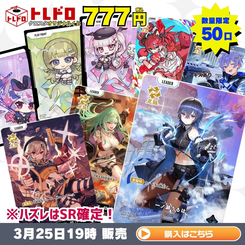 【トレドロバックナンバー】3/25 トレドロ販売!! 本日発売のクロスタのトレドロは 1口777円 のトレドロを50口ご用意致しました!! 気になる大当たりは! 【一ノ瀬うるは】 【八雲べに】 【小森めと】 等々豪華な仕上がりとなっております!! 発売は 3/25(水)19時より販売開始!! それでは早速封入カードをチェック!! ※販売価格は全てくじ作成日(3/25)の価格となります。 当たり! 一ノ瀬うるは1枚 1口 11800円(税込) 当たり! 八雲べに1枚 1口 9780円(税込) 当たり! 小森めと1枚 1口 6480円(税込) 当たり! 赤見かるび1枚 1口 5280円(税込) 当たり! ★キズあり★白雪レイド1枚 1口 3213円(税込) 当たり! PLAY POINT[空澄セナ]1枚 1口 1280円(税込) 当たり! PLAY POINT[英リサ]1枚 1口 1180円(税込) 当たり! PLAY POINT[兎咲ミミ]1枚 1口 1180円(税込) ハズレ… ロケットランチャー1枚 7口 280円(税込) ハズレ… ★キズあり★勝利へのジャンプ1枚 8口 170円(税込) ハズレ… ★キズあり★恐怖の迷宮1枚 8口 170円(税込) ハズレ… ★キズあり★三銃士1枚 7口 170円(税込) ハズレ… ★キズあり★勝利の雄たけび1枚 7口 170円(税込) ハズレ… ★キズあり★オールスターコンボ1枚 5口 170円(税込) クロスタトレドロ777円クジは 3/25(水) 19時より発売開始!!! ご購入は下の画像をクリック!!